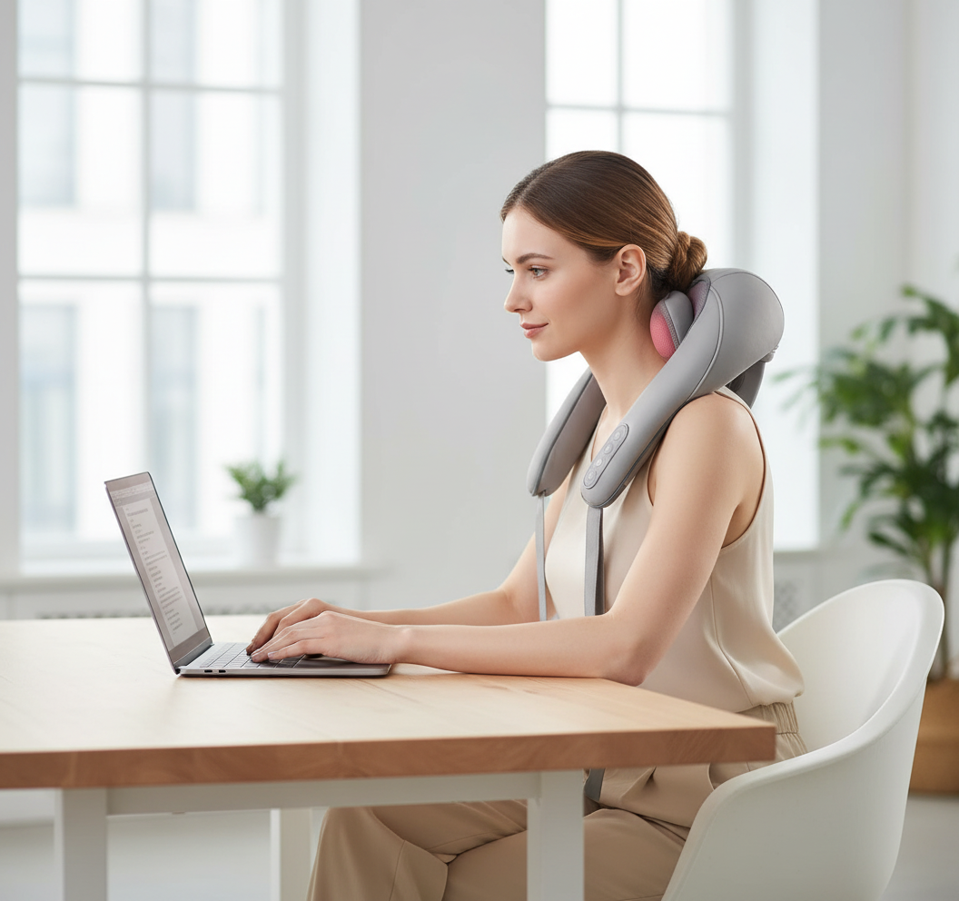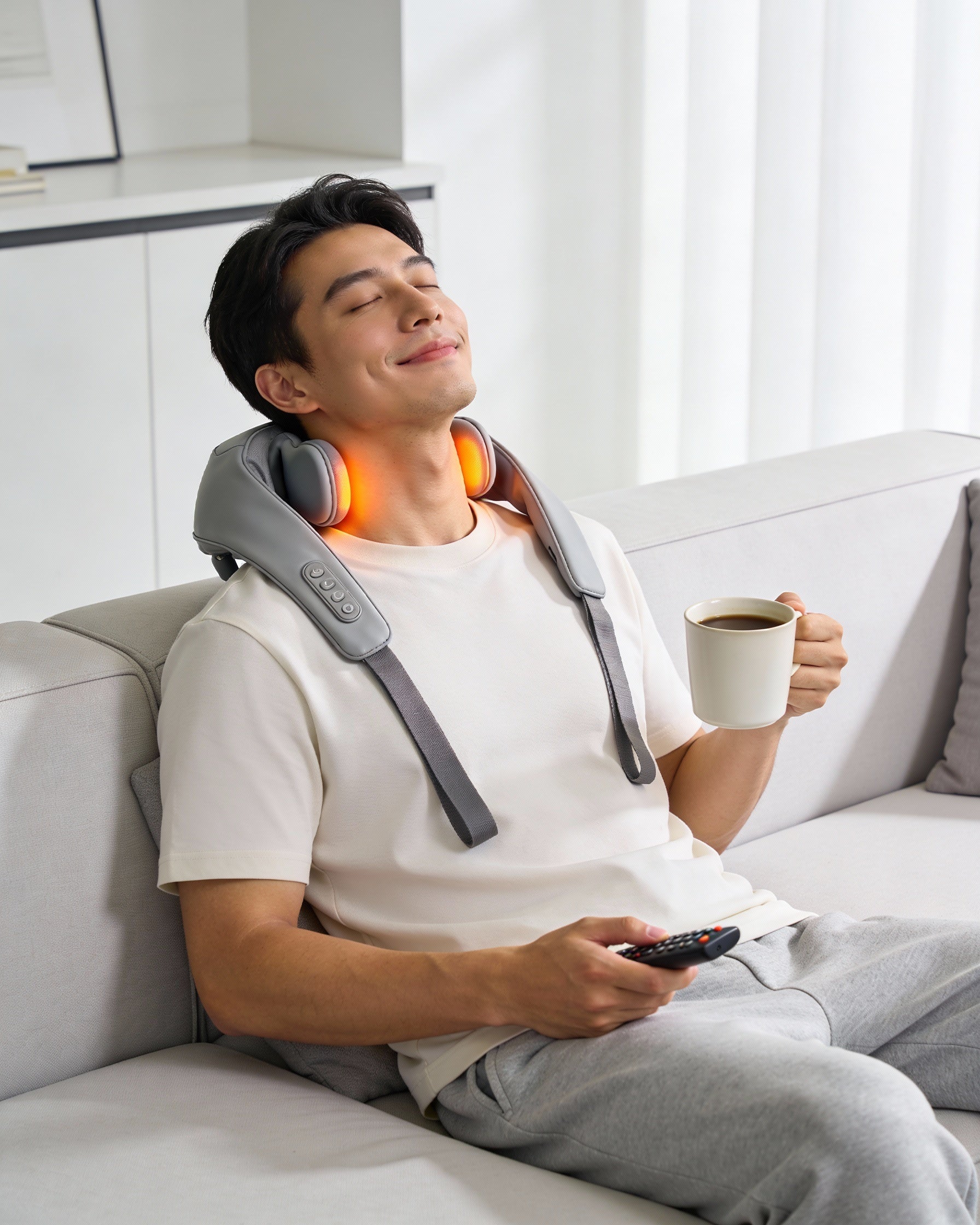 Sus nodos de amasado 3D simulan el movimiento de manos expertas para deshacer nudos y tensiones profundas en el cuello y hombros.